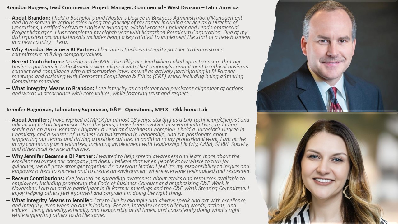 At the heart of our company’s values are the individuals who go above and beyond to foster a culture of compliance and ethics, transparency, and trust. This month, we proudly spotlight two employees who have demonstrated commitment and initiative in their roles as Business Integrity (BI) Partners.
